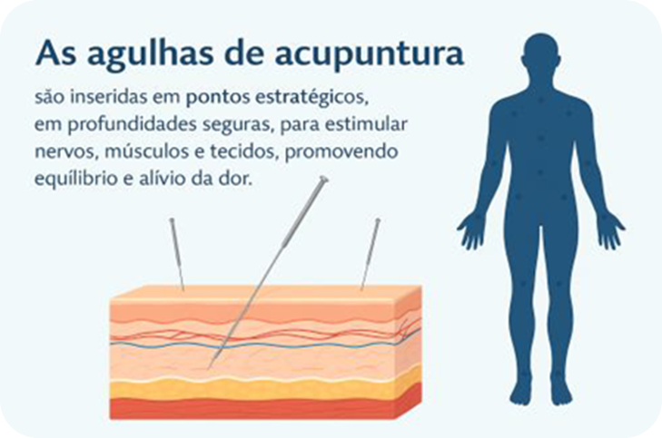 A acupuntura é uma prática reconhecida pela medicina que auxilia no alívio da dor e no equilíbrio do organismo. Por meio da aplicação de agulhas finas em pontos estratégicos do corpo, estimula nervos, músculos e tecidos, promovendo a liberação de substâncias naturais que reduzem a dor, melhoram a circulação e contribuem para o bem-estar físico e emocional.